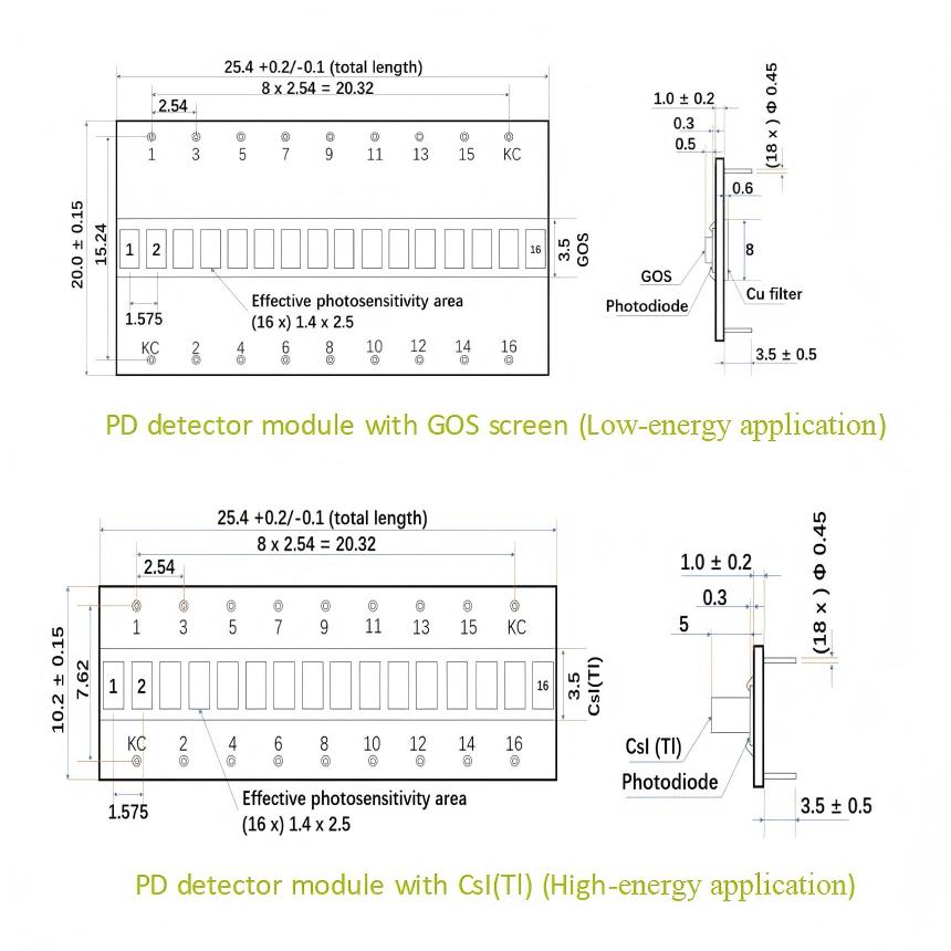 SatuPD16CA series detector module is a linear detector array (LDA) composed of 16-pixcel front-side illuminated (FSI) silicon photodiode. Silicon photodiode feature low dark current, low terminal capacitance, high photosensitivity, and wide coverage, making them suitable for various X-ray detection applications. Available in two PCB sizes (wide and narrow versions), the module can be coupled with scintillators such as GOS, CsI, CdWO₄, and GAGG to enable single-energy or dual-energy imaging. The meticulously designed assembly process ensures easy integration, stability, and reliability.